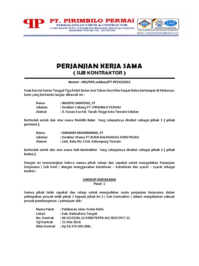 Contoh Surat Perjanjian Sub Kontraktor Doc